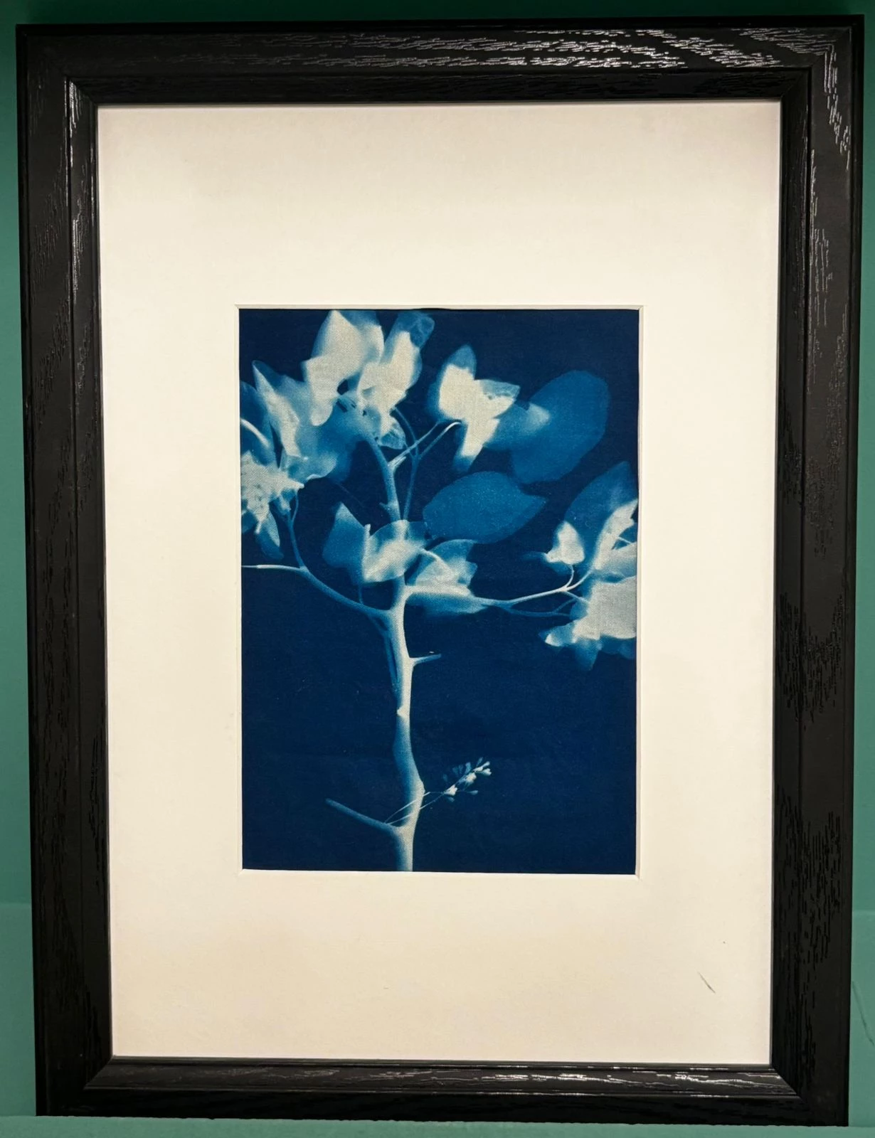 The work presents tree branches transforming into translucent shadows, closer to memory than to a fixed form. The elements appear like an old photograph, developed through light, not documenting a moment but evoking its sensation. Using the cyanotype technique, light becomes a medium of time, and the blue tone turns into a space between presence and absence—where the trace endures longer than the object itself.يمثّل العمل أغصان شجر تتحوّل إلى ظلال شفافة، أقرب إلى ذاكرة منها إلى شكل ثابت. تظهر العناصر وكأنها صورة قديمة، مُحمّضة بالضوء، لا توثّق اللحظة بقدر ما تستدعي إحساسها. باستخدام تقنية السانوتايب، يصبح الضوء وسيطاً للزمن، وتتحوّل الزرقة إلى مساحة بين الحضور والغياب، حيث يظلّ الأثر أطول من الشيء نفسه.
