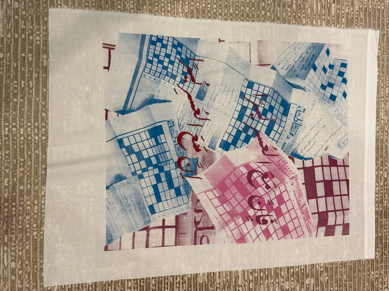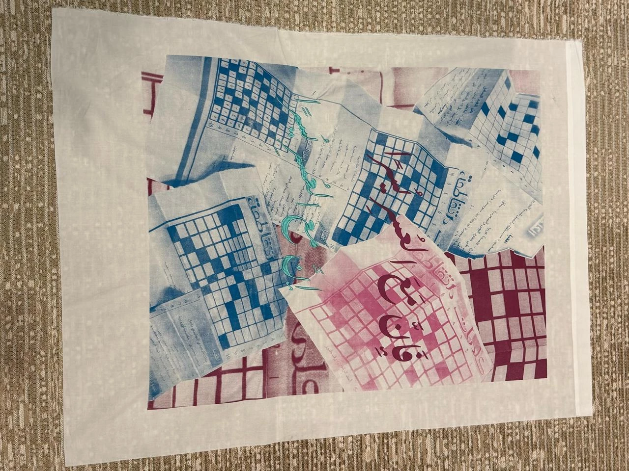 This textile-based project explores collective memory through the act of folding; drawing from a repetitive gesture practiced by the artist’s grandfather during the middle stages of Alzheimer’s disease. As verbal communication faded, folding became a quiet, embodied language shared within the family. The project translates these gestures into textile form, treating fabric as a carrier of memory and care. Each textile captures a unique folding technique recalled by the artist’s aunts and uncles. Though the gesture remains constant, each memory varies, exposing how recollections fracture and shift between individuals. These differences weave together a collective archive. Each folding technique is paired with a material personally associated with the artist’s memory of her grandfather: a napkin as the primary form, a book reflecting his relationship to the Arabic language, and a newspaper crossword recalling moments of routine and focus. These materials are integrated through unique folding methods, transforming remembrance into physical construction. Color functions as an emotional language within the textiles, with each palette reflecting a specific feeling. Each piece is embroidered and printed with the verse { فَإِنَّ مَعَ الْعُسْرِ يُسْرًا إِنَّ مَعَ الْعُسْرِ يُسْرًا } the last verse her grandfather shared before losing speech. The works are printed on 100% cotton thoub fabric, chosen for its personal significance as the artist’s grandfather’s preferred material. This artwork was developed through the support of Misk Art Institute.